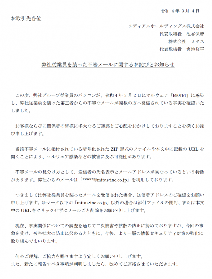 弊社従業員を装った不審メールに関するお詫びとお知らせ